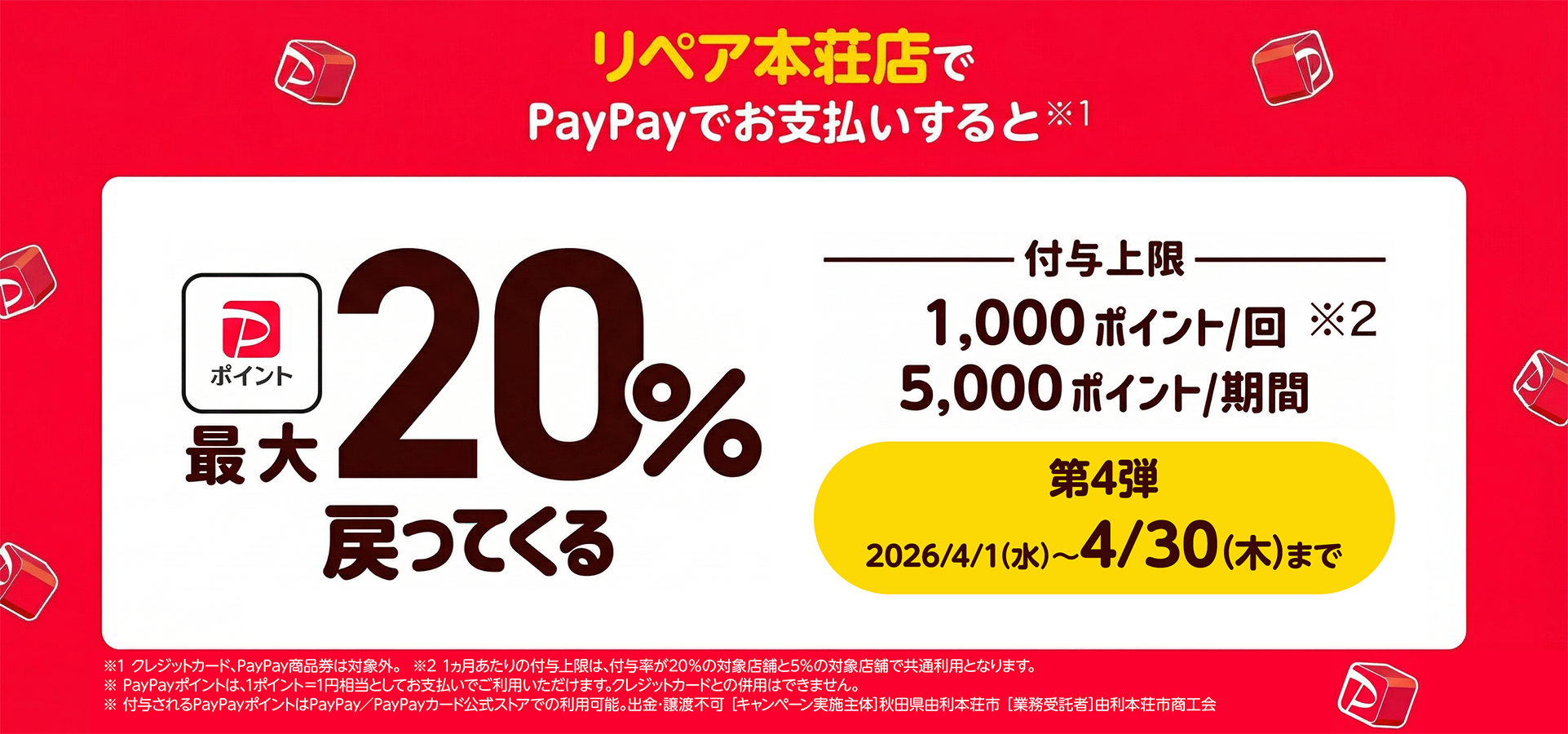 リペア本荘店にてPayPayで決済いただいた際のキャンペーンが開催されます! この機会にぜひ当店でPayPayをご利用ください。 開催期間:2026年4月2日(木)〜4月30日(木) 対象店舗:リペア本荘店 対象決済:残高、PayPayクレジット ※PayPayクレジット以外のクレジットカード、PayPay商品券は本キャンペーン対象外 特典:決済金額の最大20%のPayPayポイントを付与 付与上限:1,000ポイント/回、5,000ポイント/期間 その他詳細はキャンペーンサイトをご確認ください。 https://paypay.ne.jp/event/akita-yurihonjo-city-20260401/ ... 続きを読む